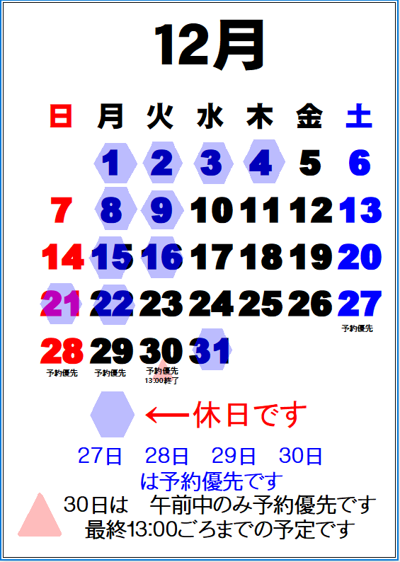 年末 27日 28日 29日 30日は予約優先です